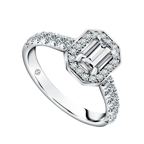 Selain tatahan pear-shaped, berlian dengan potongan emerald juga favorit jadi pilihan. MONDIAL memiliki koleksi cincin tunangan dengan tatahan berlian potongan emerald. Berlian bentuk emerald memancarkan kesan elegan dan makna simbol hati yang terbuka dan bersahaja. Desain cincin tunangan ini berbalut white gold dan dilengkapi dengan tatahan berlian emerald F VVS.