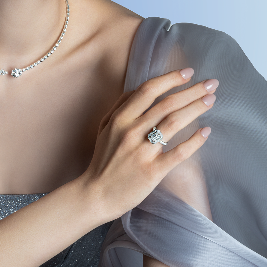 Sentuhan elegansi dari Realm Grace menghadirkan diamond rings dengan potongan emerald cut yang khas. Hadir dengan facet lebar dan sudut tajam yang memantulkan cahaya secara lembut namun memukau. Potongan ini memberikan kesan vintage dan elegan, sangat identik dengan gaya timeless seorang putri dari negara terkecil di dunia yang terletak di benua Eropa. Memancarkan ketenangan dan keanggunan tanpa berlebihan, cocok untuk Anda yang menghargai kemewahan klasik dan feminin.