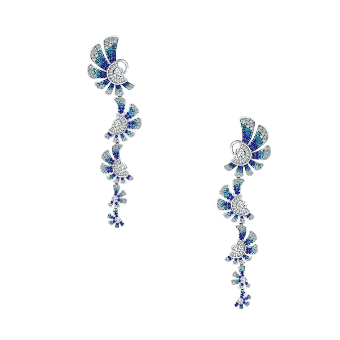 Selanjutnya ada anting-anting dengan bentuk menyerupai kipas ini dibuat dengan cermat menggunakan berlian bulat dan marquise, menggambarkan burung yang menari dengan anggun. Safir biru menonjolkan tepi luar setiap sayap, melambangkan langit cerah yang begitu memikat.