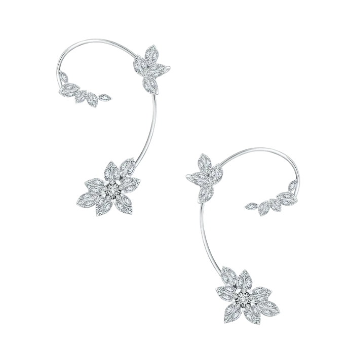 Selanjutnya ada Diamond Blossom Mismatched Earrings yang menampilkan keanggunan bunga. Salah satu anting-antingnya menampilkan bunga yang dibuat dari berlian bentuk round, sementara anting-anting pendampingnya dirangkai dengan berlian potongan marquise dan princess. Kedua bunga tersebut berada di atas tangkai emas putih yang berkilauan, memancarkan pesona tak tertandingi!