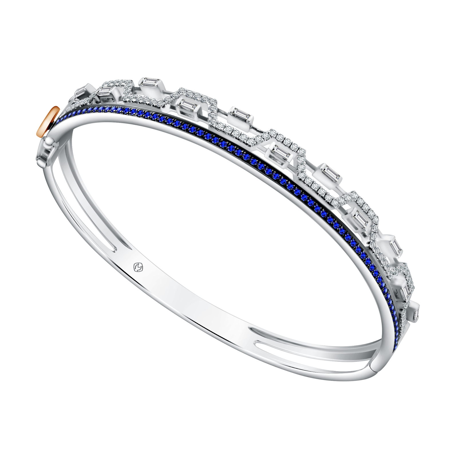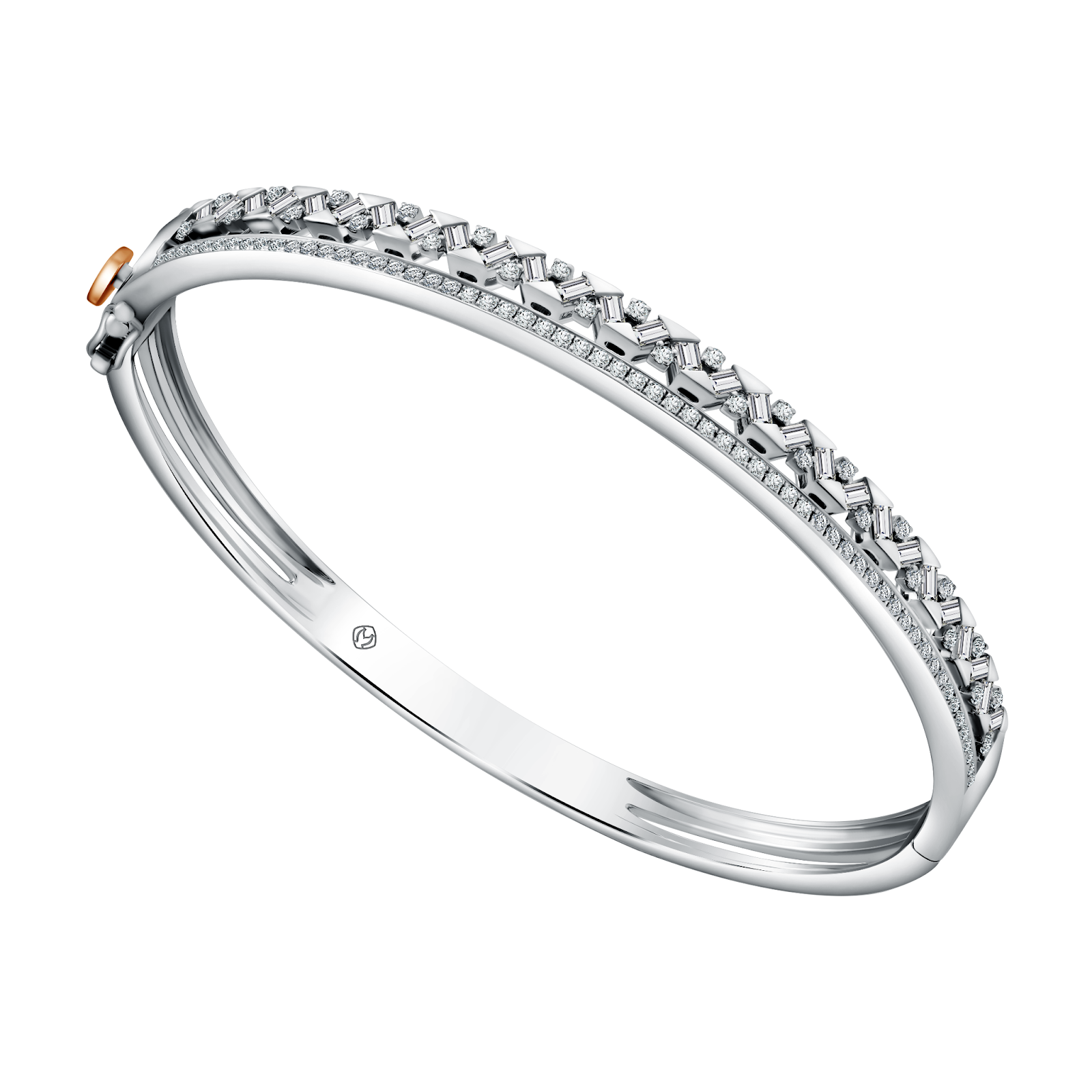 Ada juga bangle berlian bernuansa white gold yang bisa jadi pilihan. Tampil mewah dengan sematan 117 butir berlian potongan round dan baguette yang menakjubkan.