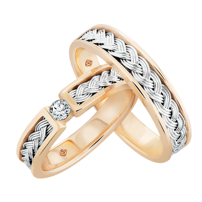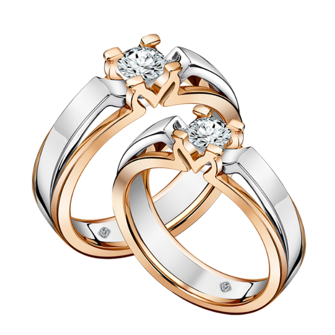 Kalau Anda mengenakan gaun pengantin dengan sentuhan modern dan kontemporer, cincin dengan desain unik bisa jadi pilihan. Model wedding ring dengan tatahan berlian dan batu permata berwarna, atau cincin two-tone mungkin jadi alternatif yang serasi untuk gaun pengantin Anda. seperti pada MONDIAL wedding ring Moira berikut yang tampil mewah dalam balutan white gold dan rose gold.