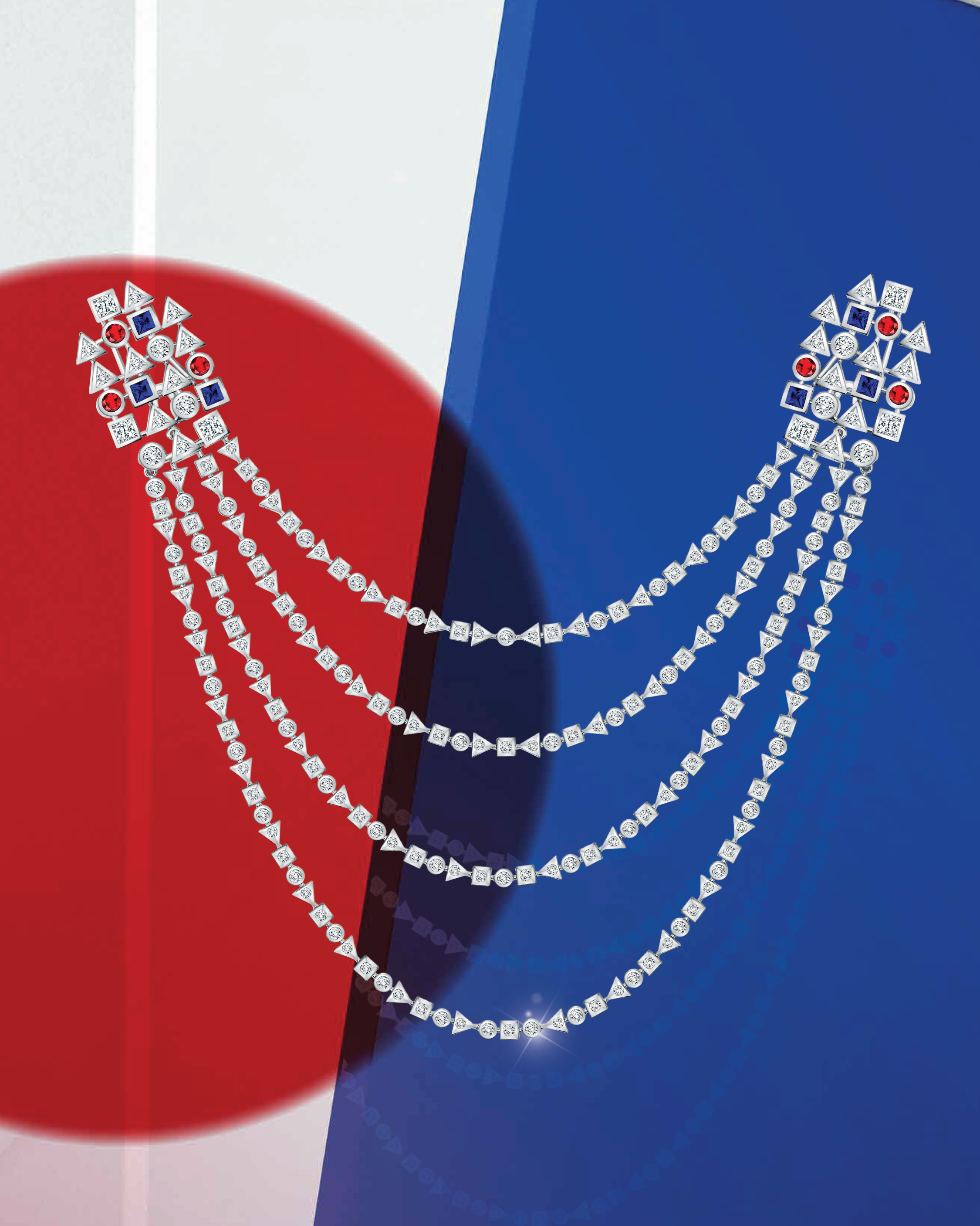 Anda bisa melihat bagaimana berlian dan precious stones sapphire disematkan dengan indah dalam cutting simple geometry yang menawan. Koleksi ini merupakan kolaborasi terbaru MONDIAL bersama Nicholas Saputra yang menampilkan kemewahan precious stone blue sapphire dan ruby yang berpadu dengan berlian.