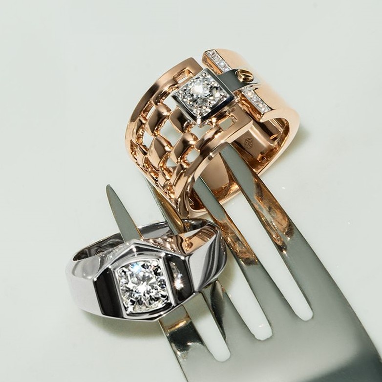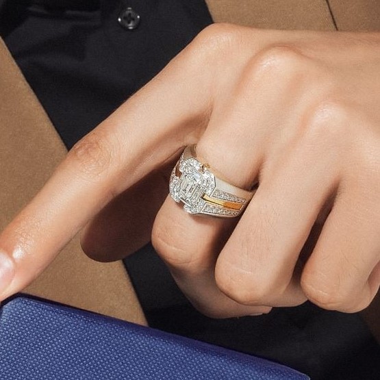 Salah satu koleksi cincin pria dengan tatahan branded diamond hadir dalam koleksi Brilliant Rose. Menampilkan sisi maskulinitas modern yang didefinisikan ulang, berlian Brilliant Rose yang cemerlang dalam paduan white gold 18 karat ini sempurna melengkapi penampilan Anda saat mengenakan batik.