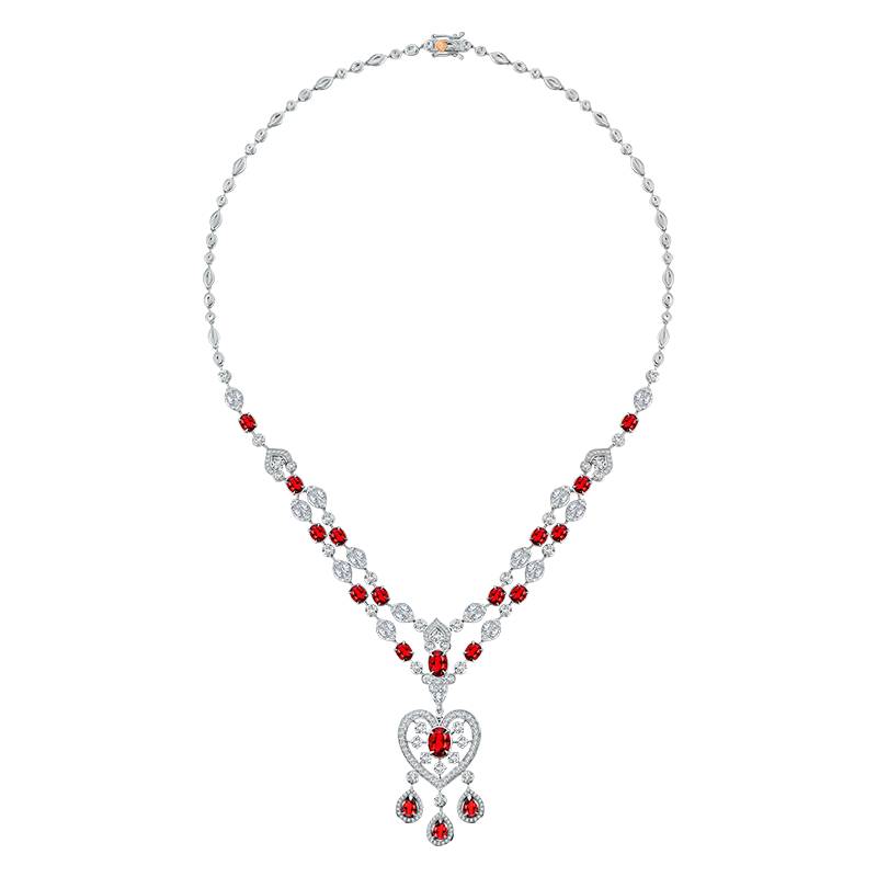 Opsi lainnya, Anda bisa memilih model kalung berlian terbaru dengan tatahan berlian dan batu ruby. Corak rona merahnya membuat pesona kalung ini makin stand out.