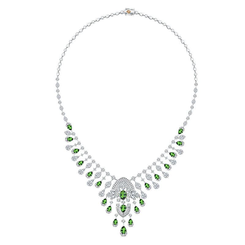 Salah satu koleksi kalung berlian terbaru dari Love Gala Collection hadir dengan desain mewah dan tatahan batu permata emerald dengan pesona corak hijaunya yang memesona.