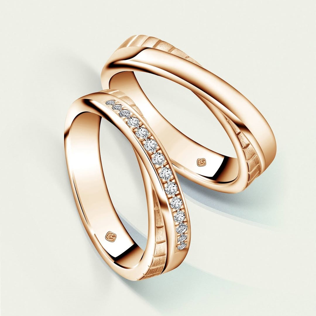 Cincin dengan nuansa rose gold dan aksen menonjol pada bagian band-nya ini memiliki pesona memukau untuk membuat penampilan Anda dan pasangan makin menawan di hari istimewa.