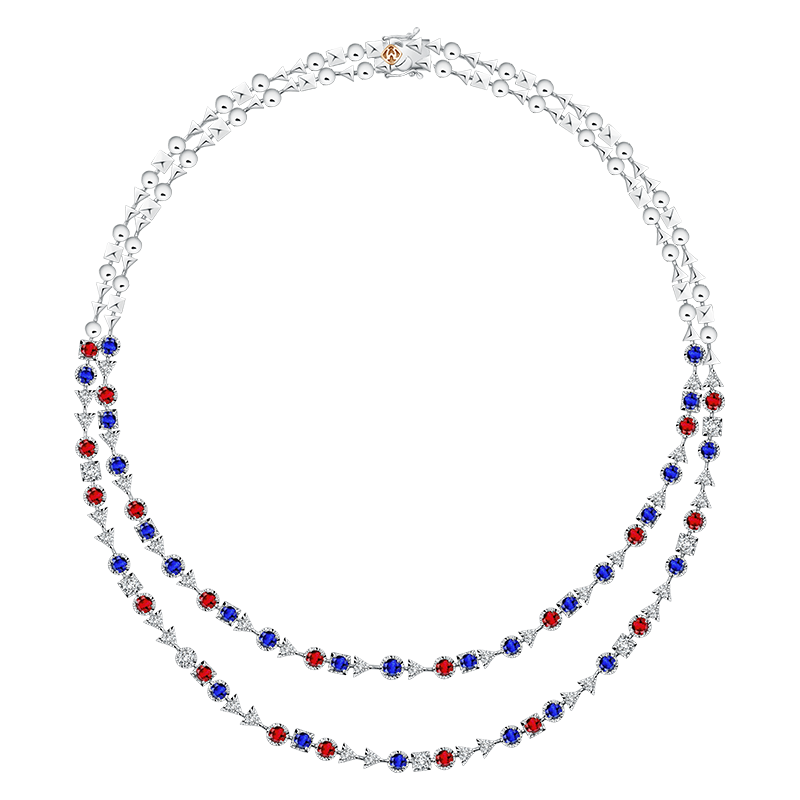 Dibuat dengan perhatian yang cermat terhadap detail, kalung berlian mewah Opulence Grand menampilkan dua lapisan batu mulia yang mempesona. Rangkaian berlian, rubi, dan safir yang megah menghiasi kalung, menciptakan interaksi cahaya dan warna yang memukau. Dengan total lebih dari 9 carat batu mulia, kalung ini merupakan pernyataan kemewahan dan kecanggihan sejati.