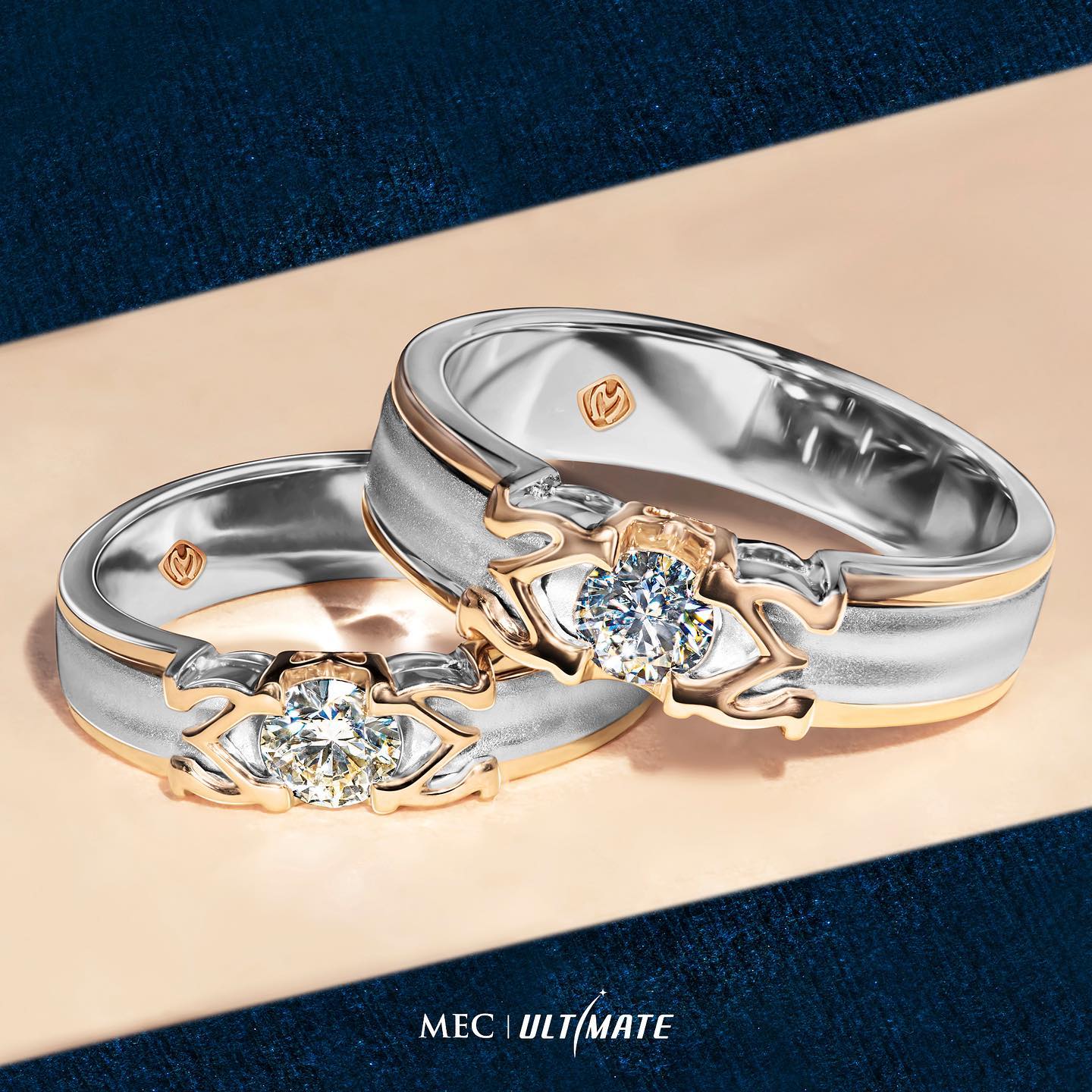 Model cincin nikah untuk mempelai pria memiliki desain ring bergelombang dengan nuansa rose gold. Adapun cincin untuk wanita memadukan nuansa rose gold dengan 16 butir round diamonddengan tingkat warna F dan tingkat kejernihan VVS. Kemudian, ada model cincin nikah bernuansa white gold dengan satu butir round MEC diamond.