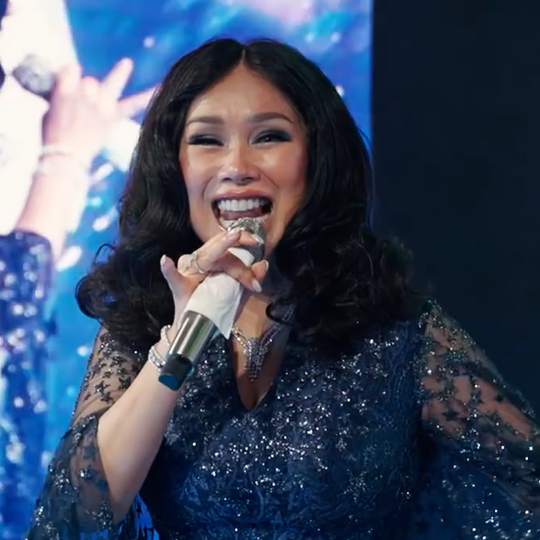 Titi DJ tampil di panggung untuk merayakan ulang tahun pernikahan MONDIAL yang ke-45. Menampilkan performa terbaiknya dalam perhiasan MONDIAL dengan pesonanya memakai gaun dengan cape berkilauan.