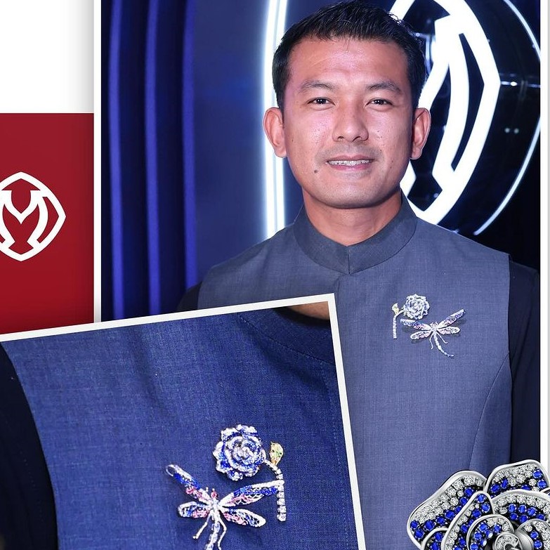 Sentuhan berkelas, Rio Dewanto tampil keren dengan bros berbentuk bunga dengan pesona berlian dan safir biru dari koleksi MONDIAL Fantasy. Koleksi yang unik, menampilkan keindahan alam dengan cara yang modern dan elegan.