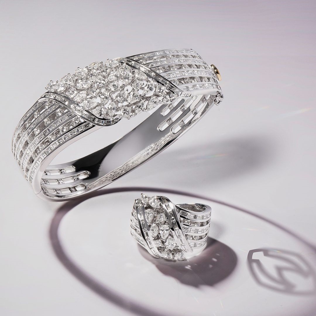 Tampilan eksklusif dari perpaduan gelang dan cincin yang memukau dari MONDIAL Gala yang dipasangkan pada white gold 18K. Koleksi ini terinspirasi oleh kemegahan era Victoria, yang menunjukkan keinginan untuk mengekspresikan diri melalui perhiasan yang glamor.