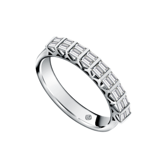 Anda juga bisa memilih model cincin lainnya yang hadir dengan nuansawhite gold.Bertatahkan berlian sejumlah 18 butirbaguette diamond yang membuat penampilan makin istimewa!
