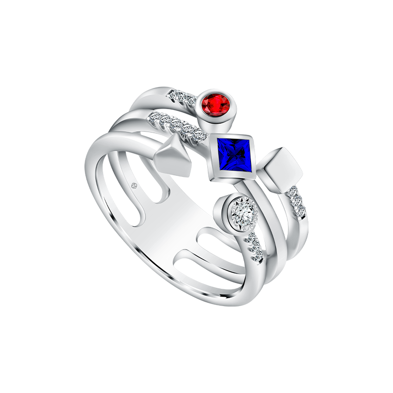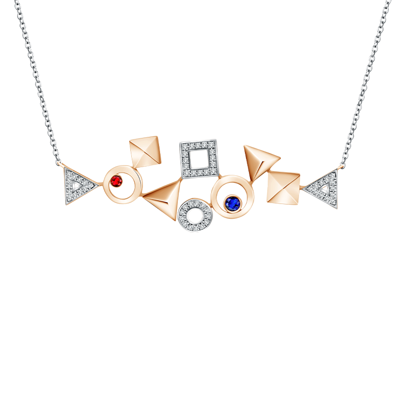 Tampilan elegan dan klasik terpancar dari kombinasi perhiasan berlian, safir, dan rubi dalam tiga bentuk dasar segitiga, lingkaran, persegi.Precious stones blue sapphire berkualitas tinggi danruby berwarna merah menawan berpadu sempurna berlian, sehingga menghasilkan keindahan perhiasan dengan desain mewah dan potongan-potongan yang cantik.