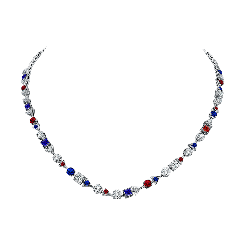 Ada sejumlah koleksi perhiasan yang menampilkan perpaduanruby,blue sapphire, dan berlian dalam koleksi ini. Salah satunya MONDIAL Precious Opulence Necklace. Kombinasi yang luar biasa dari rangkaian batu rubi dan safir dengan untaian berlian membentuk tampilan kalung yang elegan dansophisticated.
