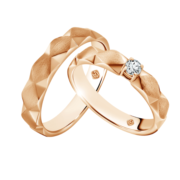Bagi para pencinta rose gold, cincin ini bisa jadi andalan. MONDIAL Aureola Fancy Facet Wedding Ring Pair hadir dengan 18k rose gold dan tatahan berlian memukau di tengahnya.